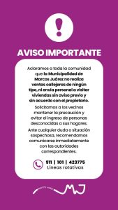 Durante las últimas horas, la Municipalidad de Marcos Juárez, a través de un comunicado, advirtió a los vecinos sobre malhechores que se hacen pasar por empleados del municipio que visitan a las viviendas ofreciendo ventas de servicios o pidiendo ingresar para revisar cuestiones públicas, como cámaras de seguridad, información de loteos, entre otras cosas.
