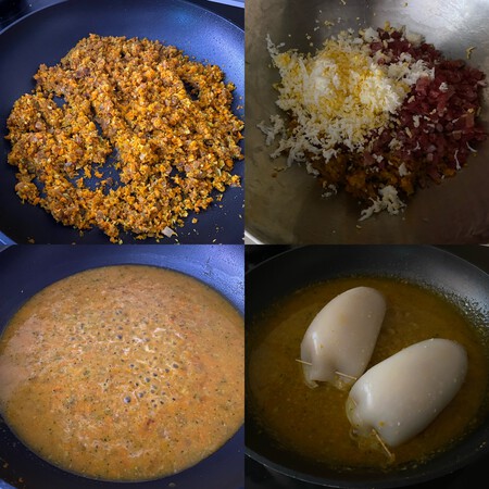 Mientras tanto preparamos los calamares. Hemos comprado solo los cuerpos limpios, así que no hay necesidad de hacer nada con ellos excepto rellenarlos con la farsa anterior. Dejamos algo de holgura, porque los calamares encogen con la cocción y, si los llenamos al máximo se podrían romper y se saldría el relleno.