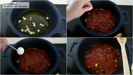 Comenzaremos poniendo el aceite en una sartén antiadherente y calentándolo suavemente. Añadimos los ajos laminados y los saltemaos ligeramente sin que se quemen. Después agregamos los pimientos del piquillo escurridos, pero reservamos el líquido. Los rehogamos durante ocho minutos a fuego medio-bajo.