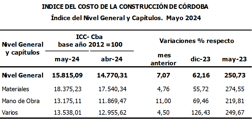 Durante el mes de mayo de 2024, el Índice del Costo de la Construcción de Córdoba (ICC- Cba) registró una variación mensual del 7,07% en su Nivel General y del 250,73% en relación a mayo de 2023.