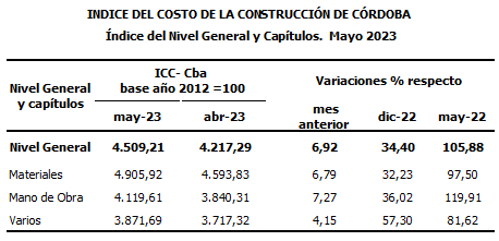 Durante el mes de mayo de 2023, el Índice del Costo de la Construcción de Córdoba (ICC- Cba) registró una variación mensual del 6,92% en su Nivel General y del 105,88% en relación a mayo de 2022.