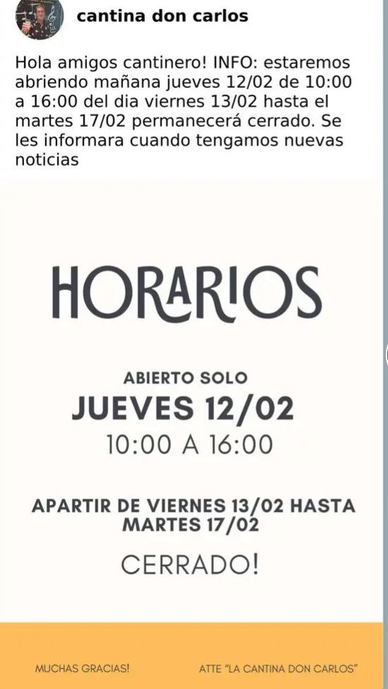 El tradicional restaurante, comunicó en sus redes que en principio cerrará sus puertas del 13 al 17 de febrero.