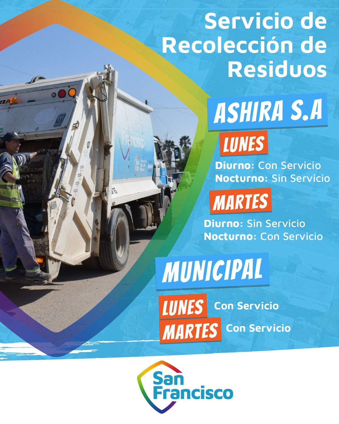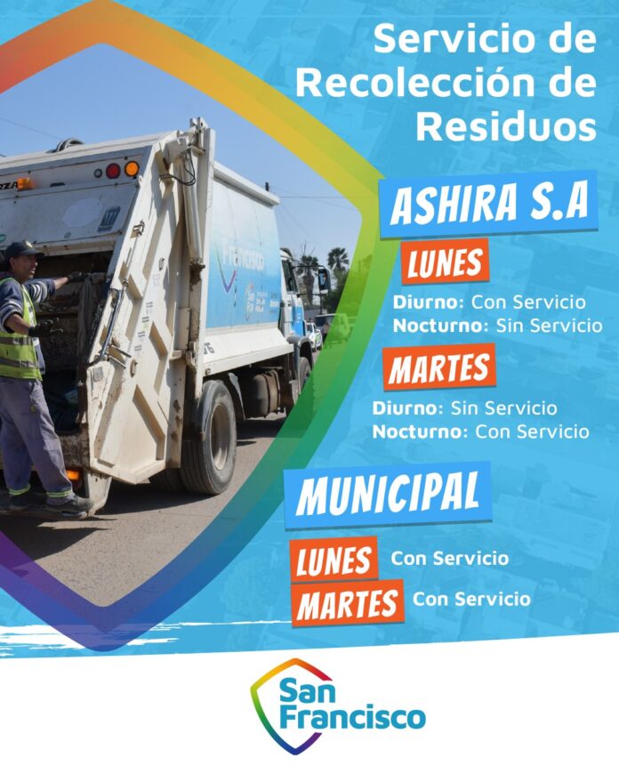 Respecto a la recolección de residuos, el lunes 16 la empresa Ashira S.A. realizará el servicio diurno con normalidad y no prestará el servicio nocturno; en tanto, el esquema correspondiente a la Municipalidad se desarrollará de manera habitual. El martes 17, Ashira no efectuará el servicio diurno y sí realizará el nocturno, manteniéndose sin modificaciones el servicio municipal.