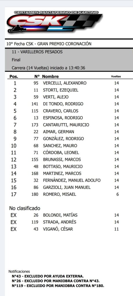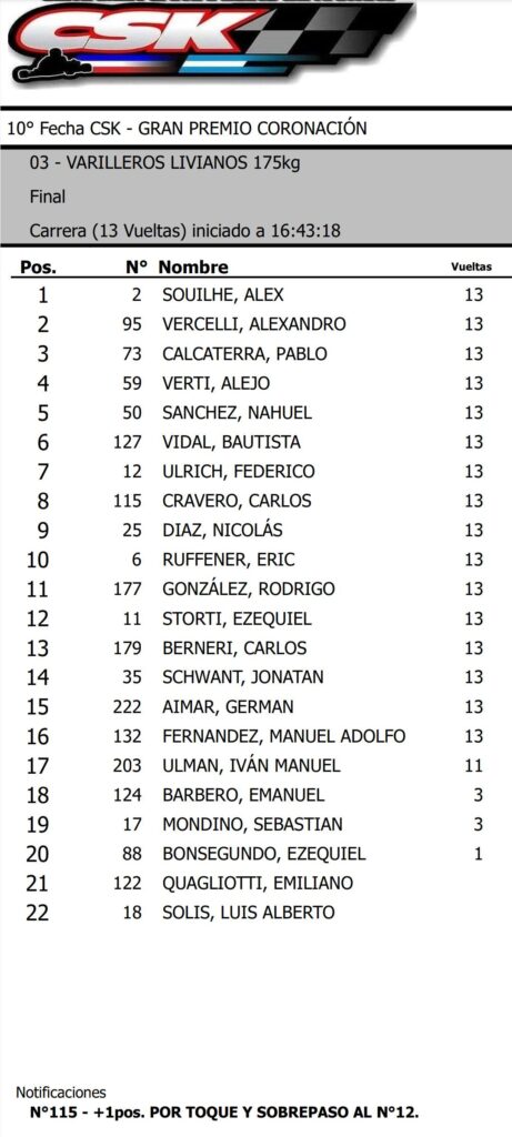 El piloto de Brinkmann Alexandro Vercelli, el pasado sábado 6 y domingo 7 de diciembre en la fecha 10 Gran Premio Coronación del Certamen Santafesino de Karting en Santa Clara de Buena Vista, obtuvo los campeonatos de las categorías Varilleros Livianos y Varilleros Pesados.