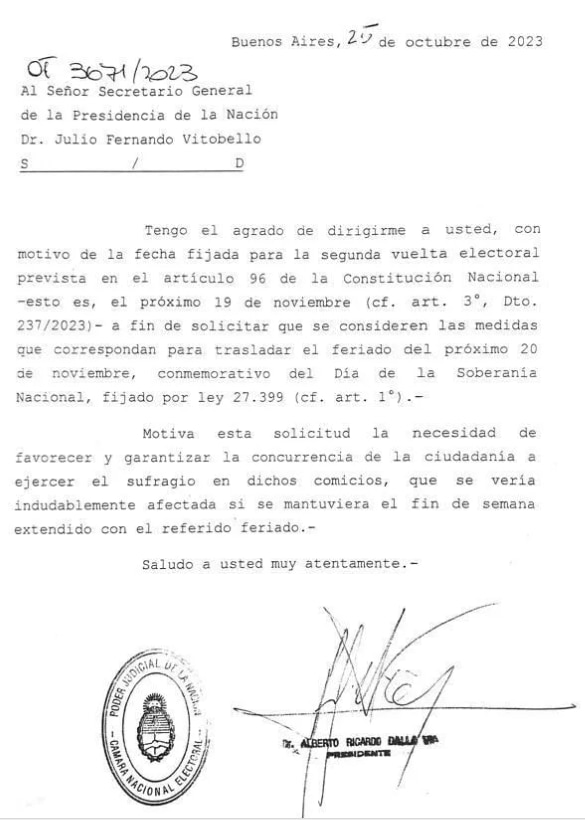 El presidente de la CNE, Alberto Dalla Vía, le envió una nota al secretario General de la Presidencia, Julio Vitobello, en la que pidió que “considere las medidas que correspondan para trasladar el feriado del próximo 20 de noviembre, conmemorativo del Día de la Soberanía”, al día siguiente de la segunda vuelta electoral.