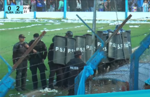 Liga Cañadense de Futbol: El club de Armstrong vencía por 2 a 0 (3 a cero en el global), cuando comenzaron disturbios que luego continuaron fuera de la cancha.