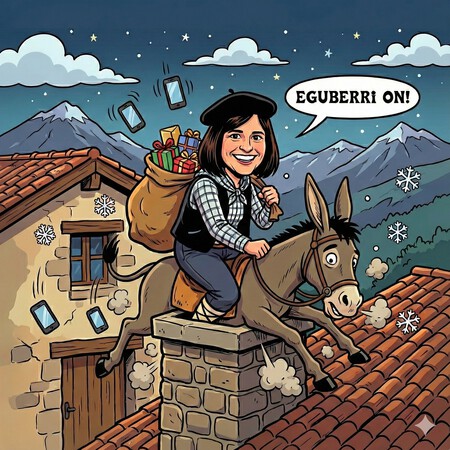 Tengo en mente dos Christmas diferentes. Para el primero voy a usar una foto mía, una foto de las Malloas (para que no coja cualquier sierra) y el euskera con su tipografía ‘Euskaraz’. Mi prompt: quiero hacer un Christmas para felicitar la navidad que sea único y especial. Quiero que uses mi foto para convertirme en Olentzero. En la escena tiene que salir el Olentzero (o sea, yo) montada sobre un burro intentando entrar por la chimenea de un caserío, en medio del monte de la sierra de Aralar. Que sea un diseño desenfadado y divertido, tipo cómic.