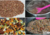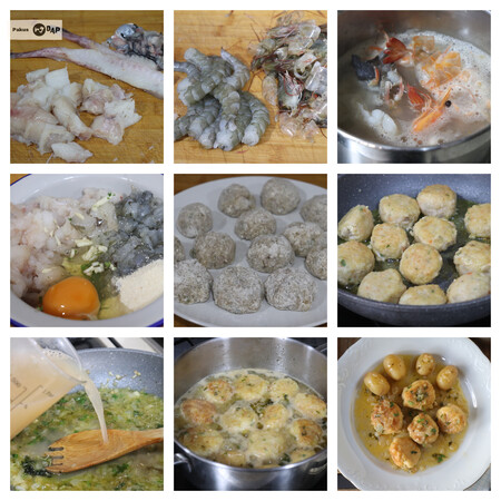 Mientras tanto, picamos bien todo el pescado y marisco y lo mezclamos con el pan rallado, el huevo, medio ajo muy picado y un poco de perejil. Formamos las albóndigas enharinándolas ligeramente y las freímos unos minutos hasta dorarlas. Reservamos.