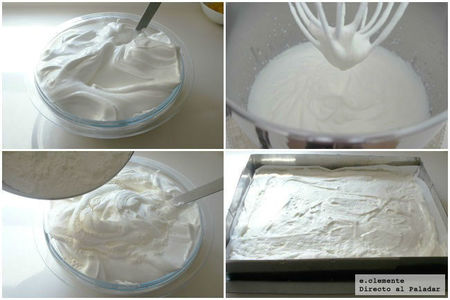 Comenzar reservando 50 g de azúcar y precalentando el horno a 200 grados Montar con una batidora la nata bien fría y procurando que tenga más de un 35% de materia grasa, hasta que esté bien firme. Reservarla para más adelante.