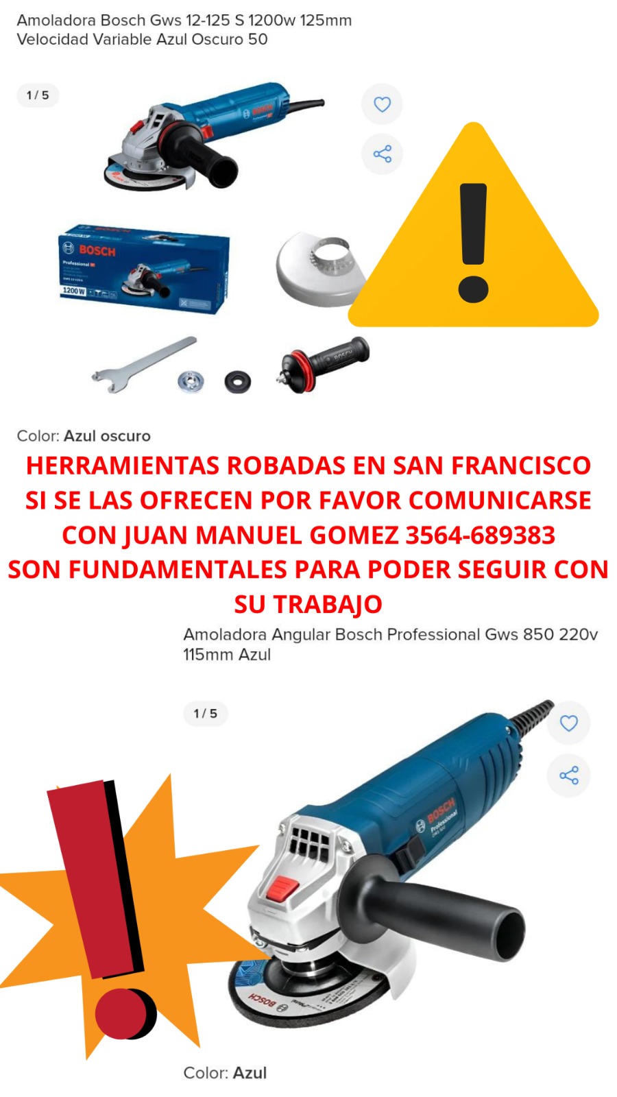 Los delincuentes sustrajeron dos amoladoras marca Bosch —una con regulador de velocidad— y dos atornilladores de la misma marca, uno a batería y otro con cable. El atornillador inalámbrico había sido adquirido recientemente para un trabajo en el Parque Industrial y aún no estaba terminado de pagar. “Para algunos es poco, para otros es mucho, pero para mí representa mucho. Uno lo obtiene con trabajo y esfuerzo”, expresó.