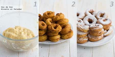 Sacamos la masa de la nevera y formamos bolitas de igual tamaño, un poco más grandes que una nuez. Estiramos cada bolita en forma de rulo, unimos y freímos por ambos lados en el aceite caliente. Pasamos a un plato con papel de cocina absorbente y una vez que las rosquillas están frías las espolvoreamos con azúcar glas.